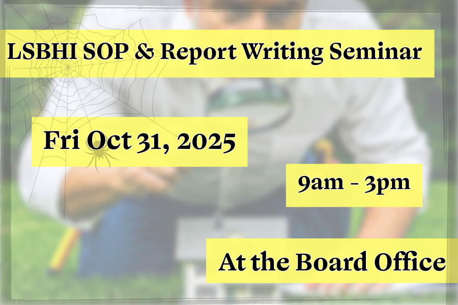 This class is approved by the LSBHI and satisfies the 90 hour required pre-licensing education step in your Louisiana home inspection licensing process.
